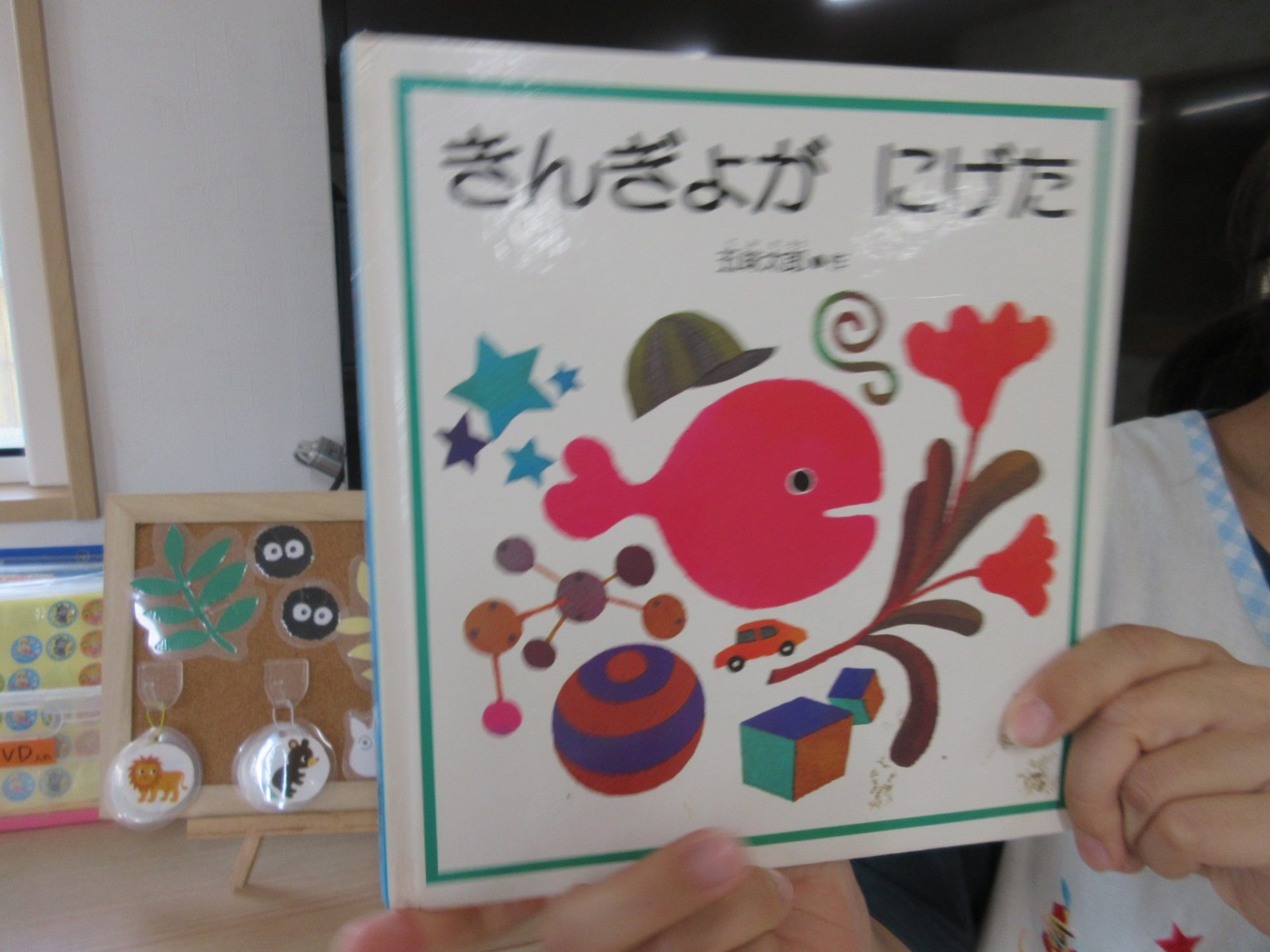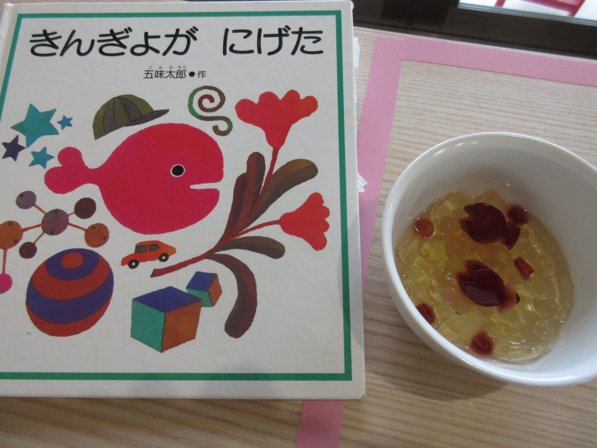 今日のお昼のおやつは、絵本おやつ🎶今日は「きんぎょがにげた」の絵本に出てくる、金魚が入っている、りんごゼリーです😋❤