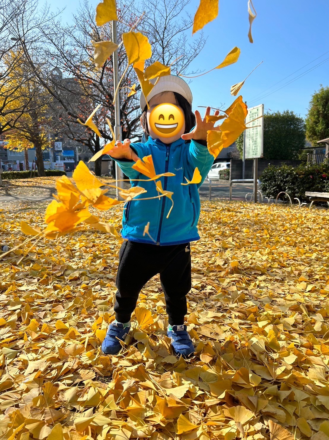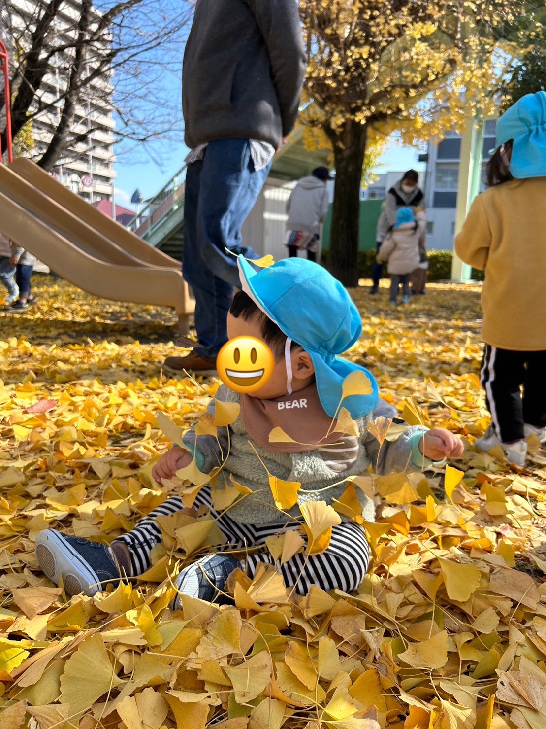 いちょうの葉っぱがたくさん落ちており、落ち葉シャワーを楽しんだり、どのいちょうの葉っぱが1番大きいか探してみたり・・・(^^)♪
