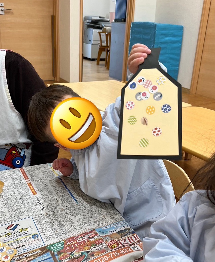 花紙をビリビリと破いたり、好きなシールを選んでぺったんと貼り付けたりして楽しみました(^o^)