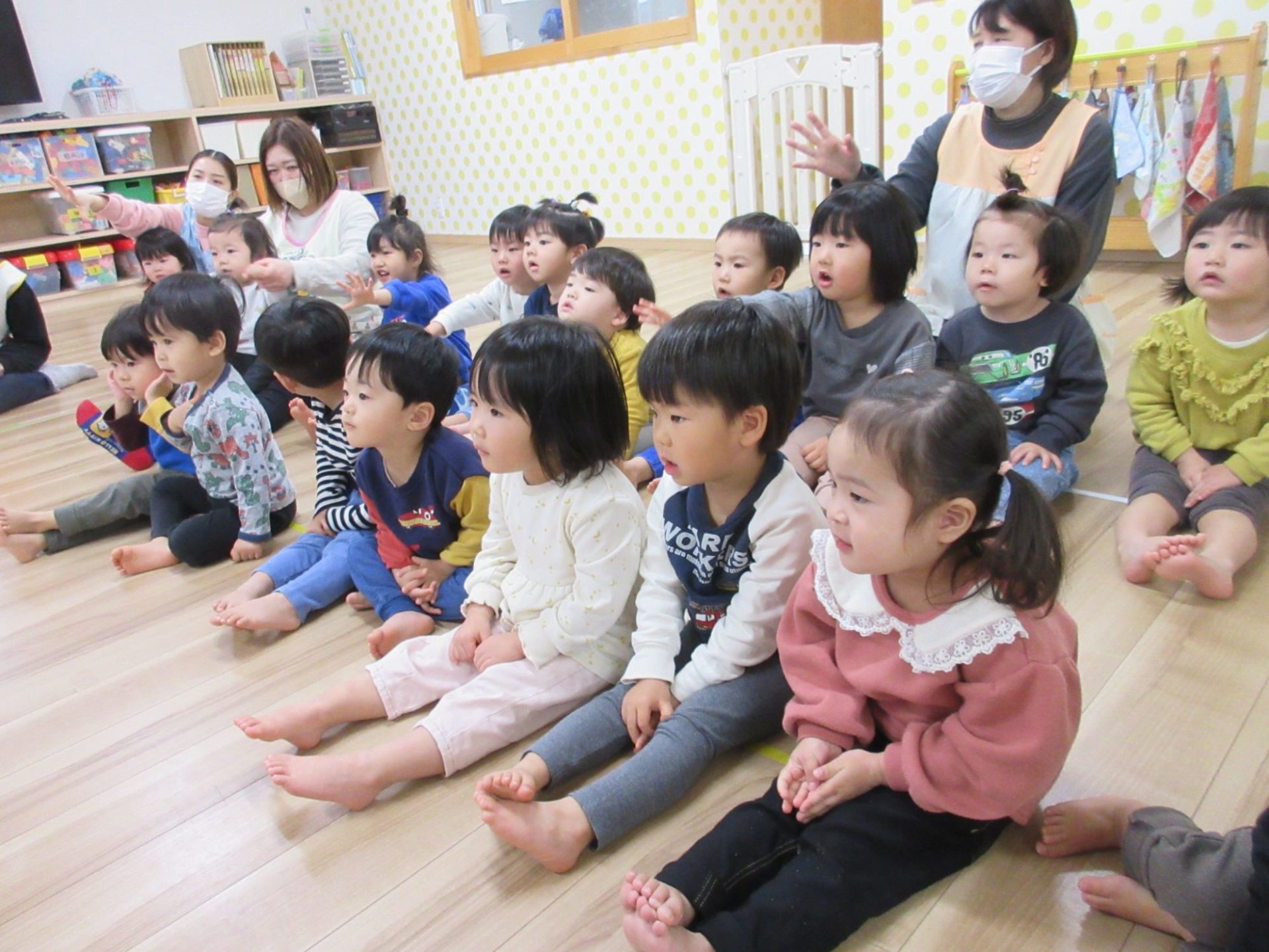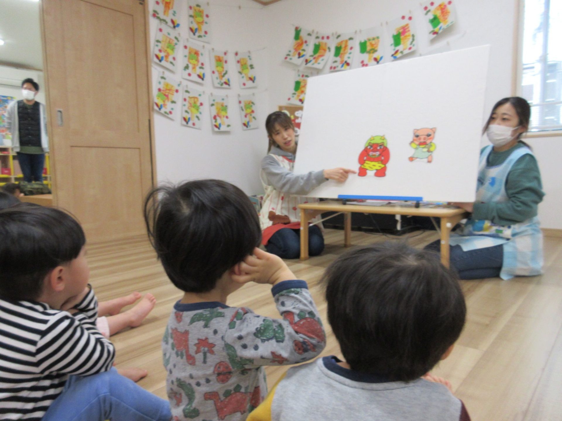 節分の日とはどんな日なのか、先生からパネルシアターでお話を聞きます☺みんなが健康で幸せに暮らせることを祈り、豆まきをして悪い鬼を体から追い出すことを知ります😀