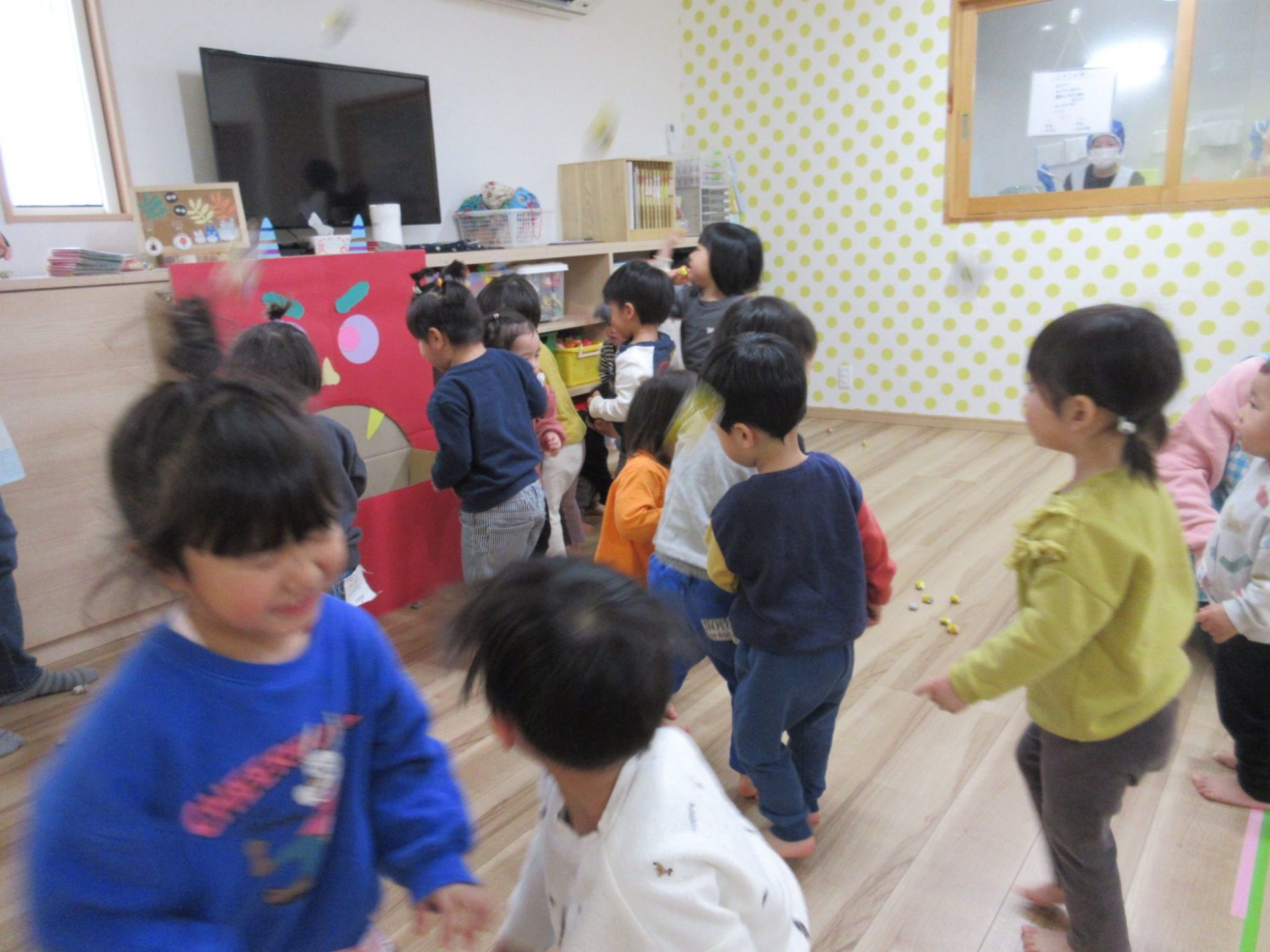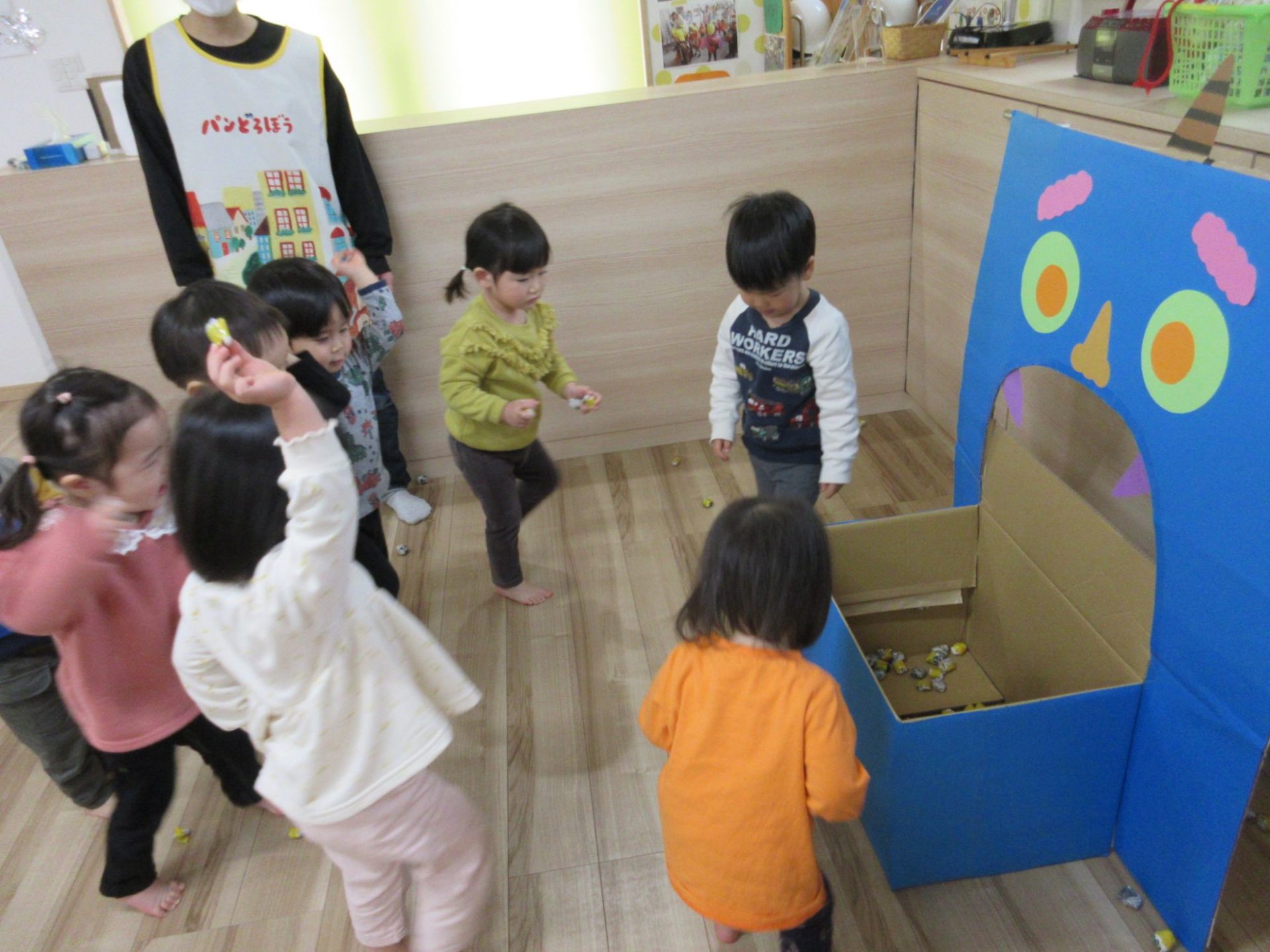 続いてお写真を撮ったあとは、豆まきごっこをしました!!大きい鬼さんにすこし怖がりながらも、みんなでたくさん豆をまきましたよ😁