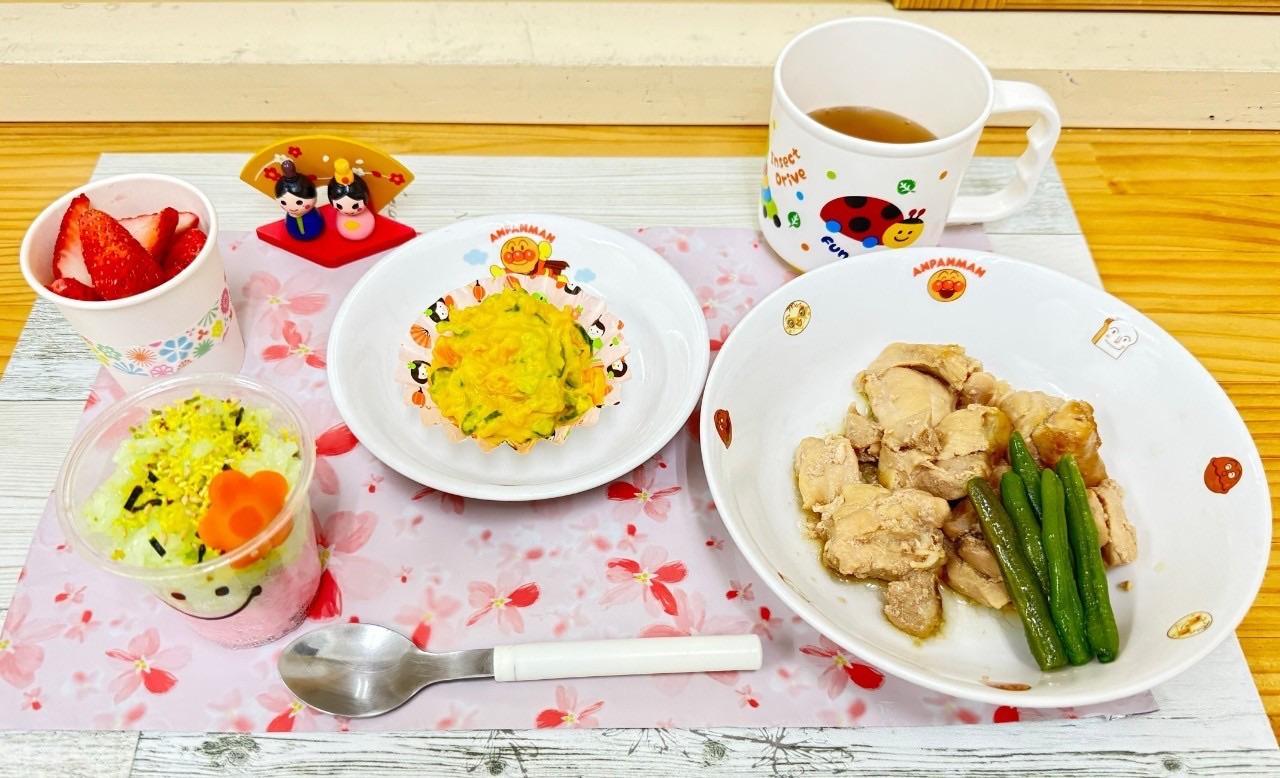 ひな祭り🎎給食⭐️鶏肉の照り焼き⭐️かぼちゃサラダ⭐️ふのすまし汁⭐️ふりかけごはん(ひな祭り風