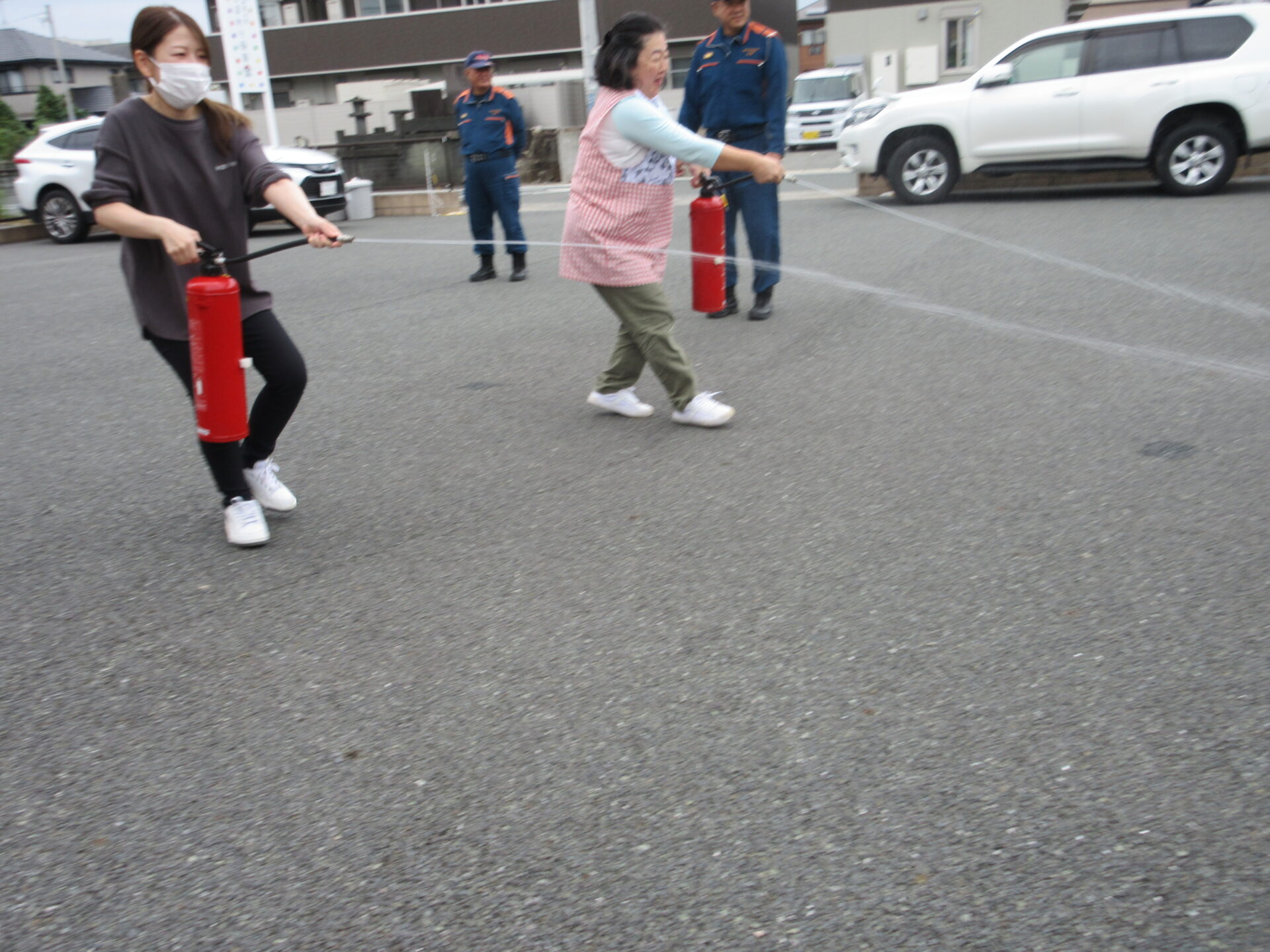 消防士の方にお話をしていただき、実際に消火器(水)を使った消火訓練を職員が行い、使い方の確認をさせて頂きました。