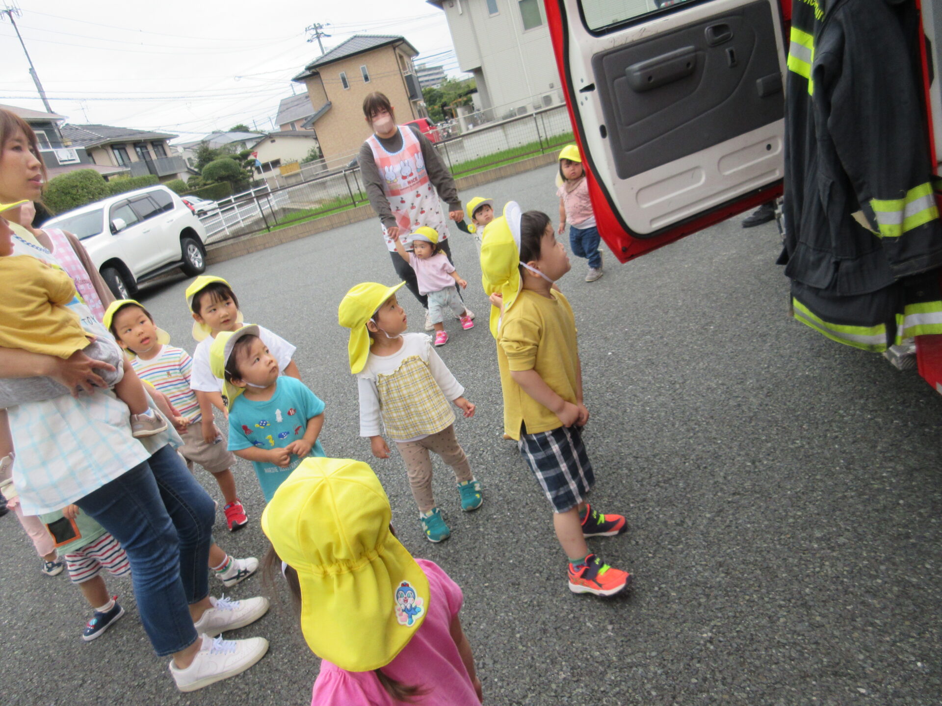 最後には子どもたちと消防車の見学をさせていただき、防火服やホースなどに触れるなど、貴重な経験をすることができましたよ!!