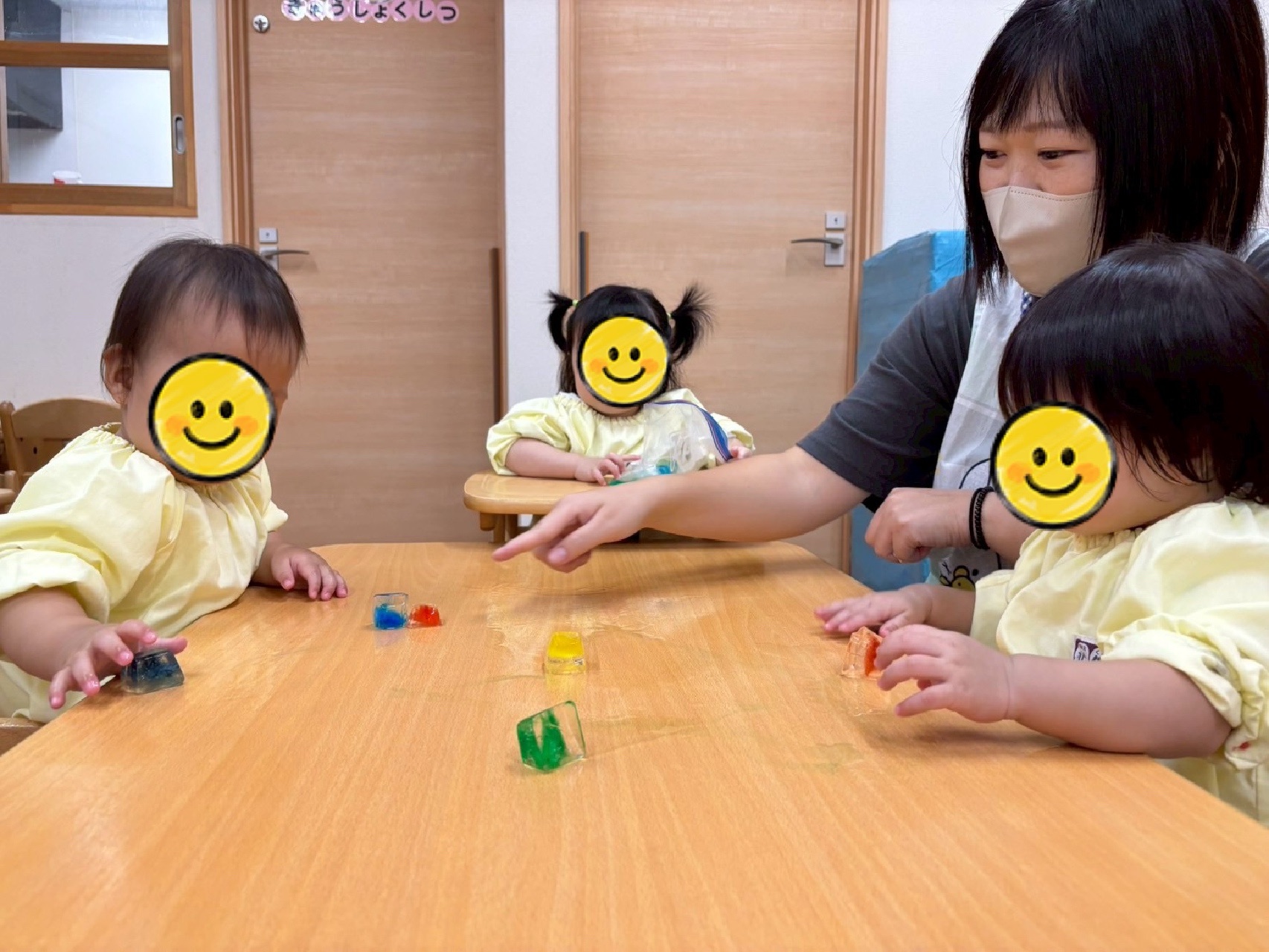 今日はすみれ・もも組さんは水に食紅を混ぜて氷を作り、手で触ったり、紙の上でお絵描きしてみたりと氷の感触を楽しみながら遊びました♪