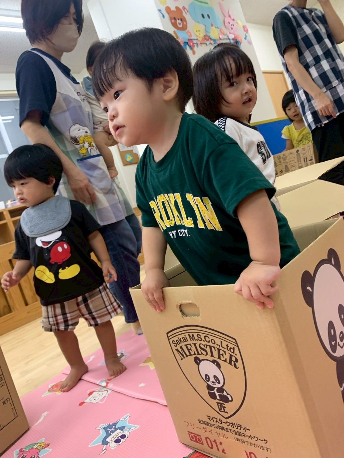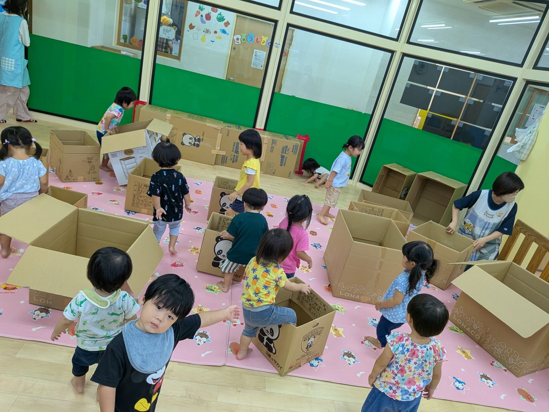 段ボールのトンネルを通ったり、大小様々な段ボールの中に入ったり、積み重ねたりと思いきり楽しむ子ども達でしたよ😄