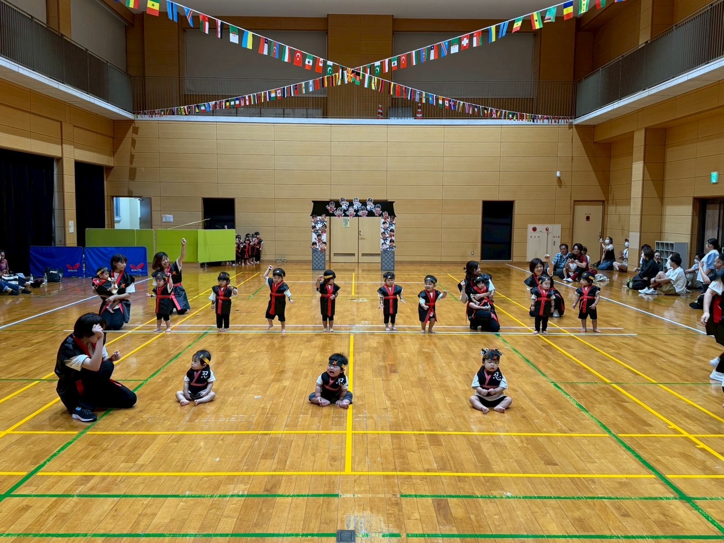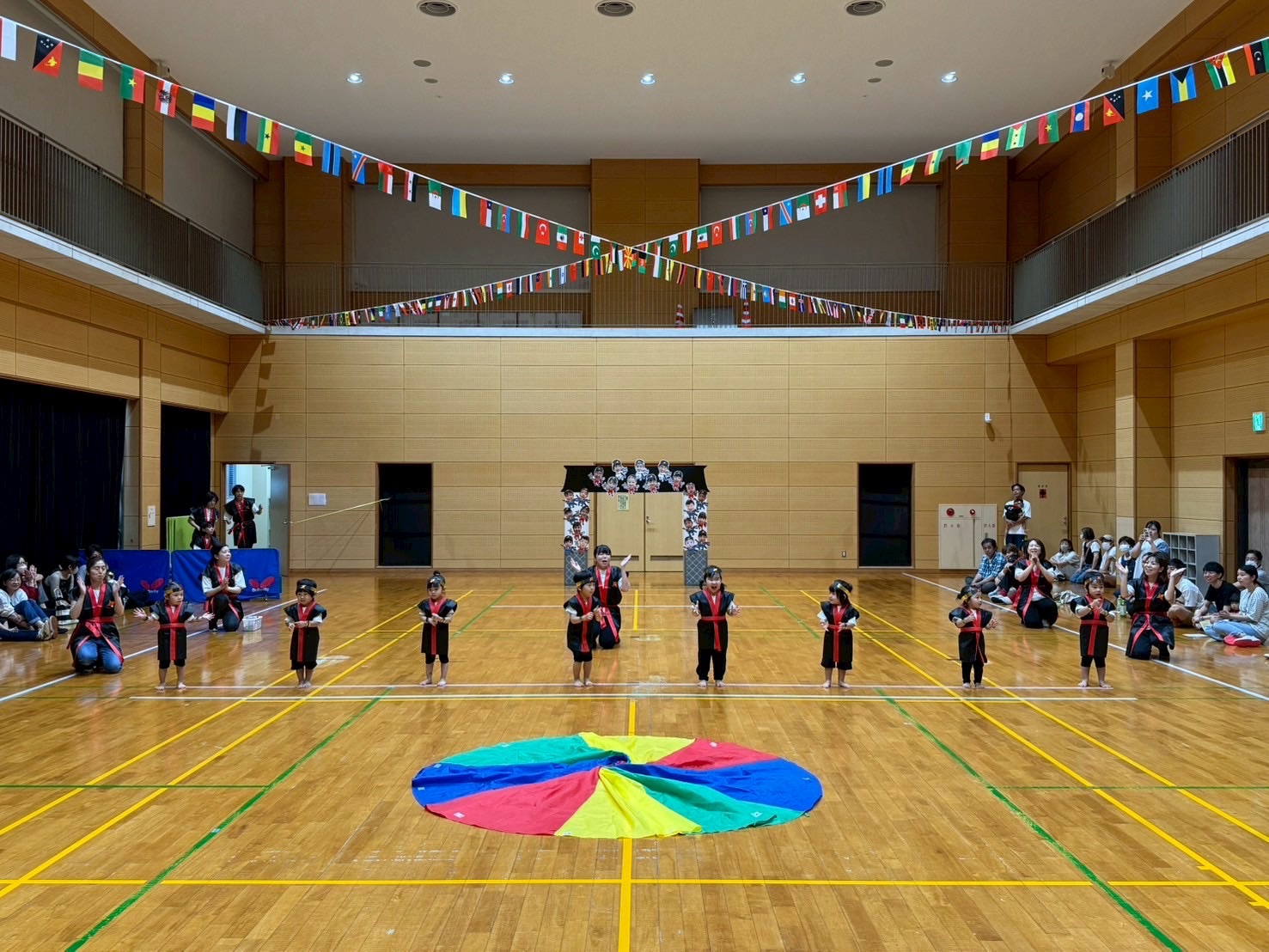 広い体育館でお遊戯を披露したりかけっこをしたり、たくさん体を動かして楽しい時間になりました。