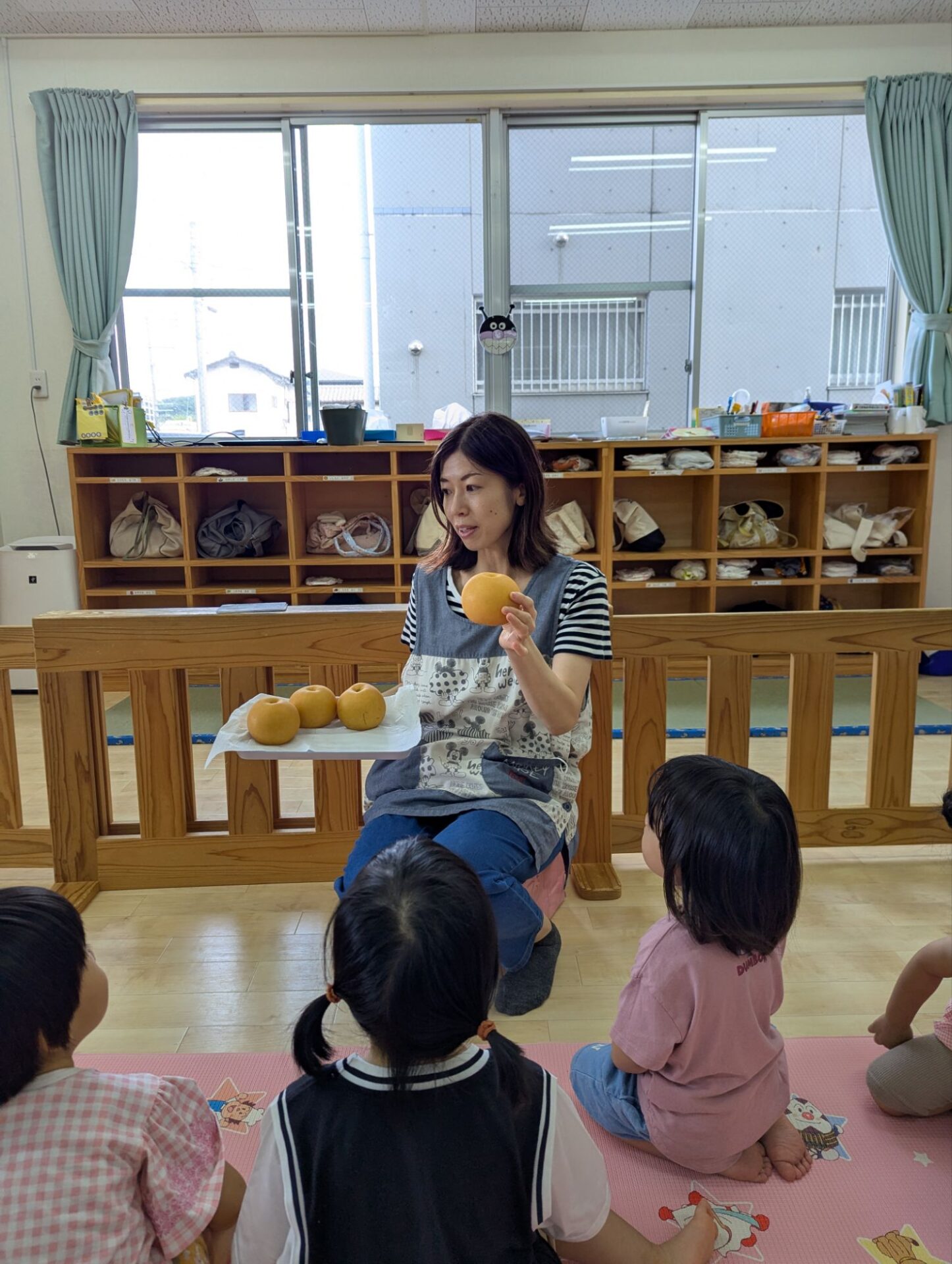 今日は食育活動で、旬の食材『梨』をみんなで触ったり、匂いをかいだりしました🤗