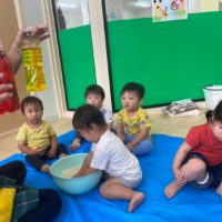 こんにちは。白坪・ひまわり保育園です! コアラグループさんは、感触遊びをしました。今回の感触遊びは…パン粉粘土 …