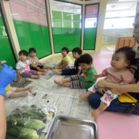 今日はぱんだグループさんときりんグループさんで とうもろこしの皮剥きをしました🌽 給食の先生か …