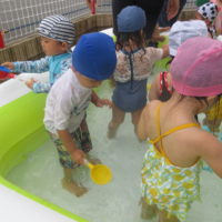 こんにちは!力合ひまわり保育園です♪ 今日は水遊びを行いました。 じょうろに水を入れて遊んだり… スコップで遊 …