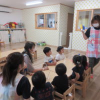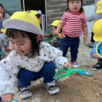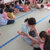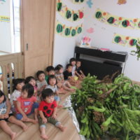 こんにちは!力合ひまわり保育園です。 今日は茎も葉も付いた枝豆を使って、枝豆ちぎりをしました。 枝豆はさやや茎 …