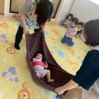 こんにちは。白坪・ひまわり保育園です。 先日ふれあい遊びをしました。 タオルの上に寝転んで歌に合わせてユラユラ …